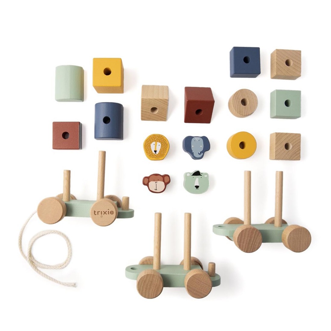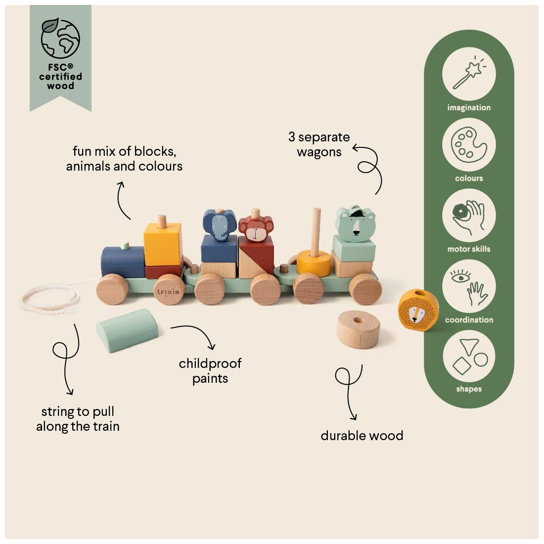 Fabriqué par la marque belge Trixie Baby, reconnue dans le monde entier pour ses jouets et accessoires pour enfants de grande qualité, ce train est conçu pour être durable et sûr. Il est fabriqué à 100 % en bois certifié FSC® et peint avec des peintures à base d’eau, non toxiques, parfaitement adaptées aux enfants.