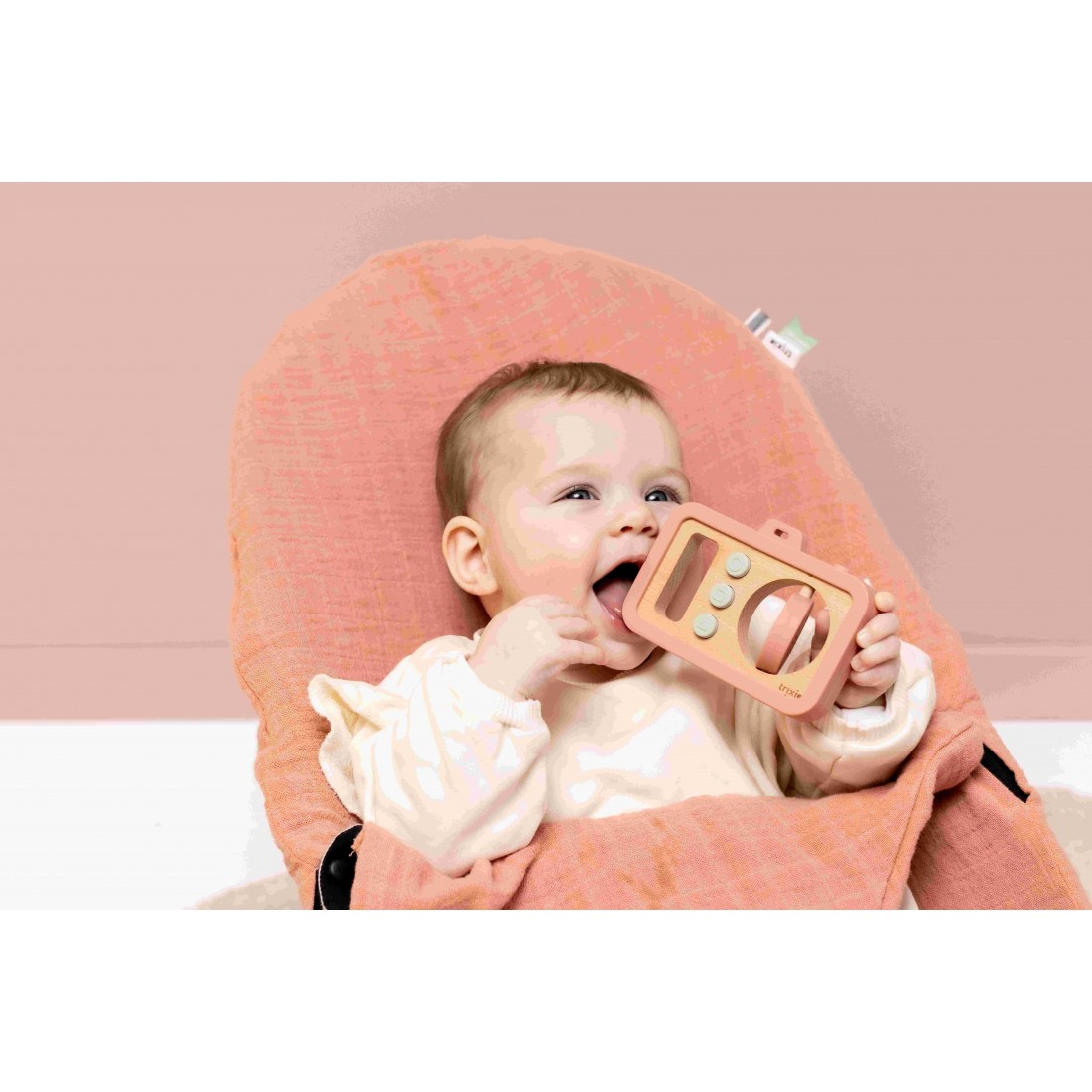 Idéal pour soulager les gencives lors des poussées dentaires, le silicone souple peut être mâchouillé en toute sécurité. Ce petit appareil photo en bois stimule aussi l’imagination : bébé peut faire semblant de capturer ses plus beaux sourires et grimaces, comme un vrai photographe !
