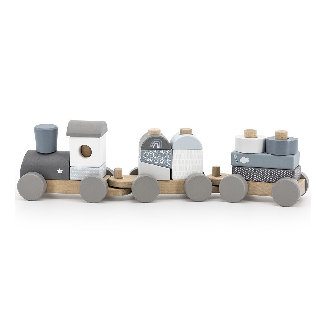 Ce train arbore de jolies couleurs tendance, dans des tons doux de bleu et gris. On y retrouve sur les wagons des petits motifs géométriques !