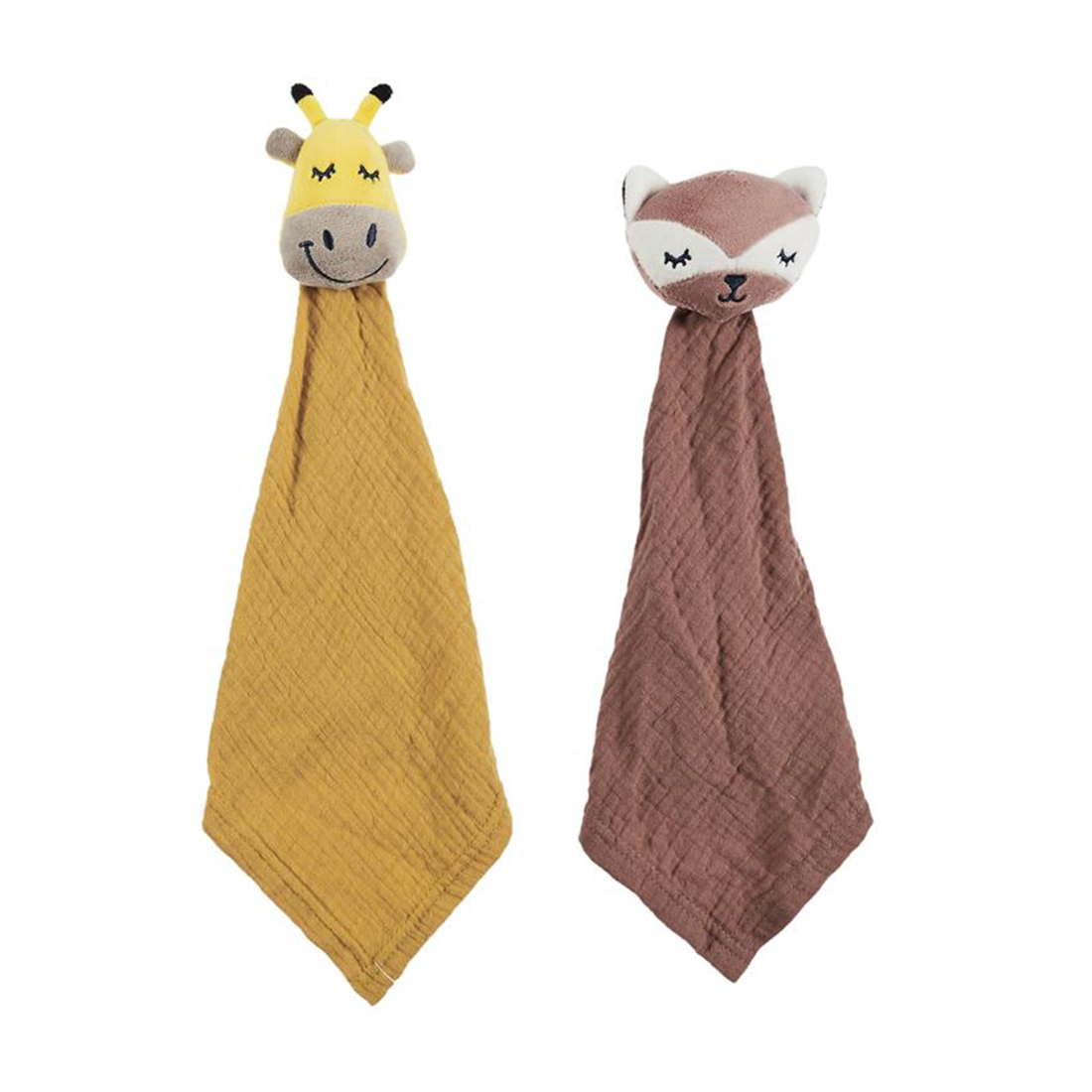 Duo de doudous pour jumeaux : Biche terracotta & Girafe moutarde (20x20 cm)