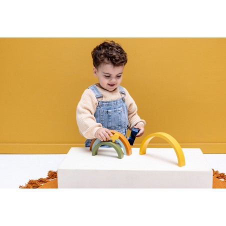 Ce set offre d’innombrables possibilités de jeu : empiler les arcs, créer des ponts ou des tunnels, construire des parcours, faire tenir les pièces en équilibre ou organiser une course d’obstacles entre le lion et le chat… Des activités infinies qui évoluent avec l’enfant et nourrissent son imagination.