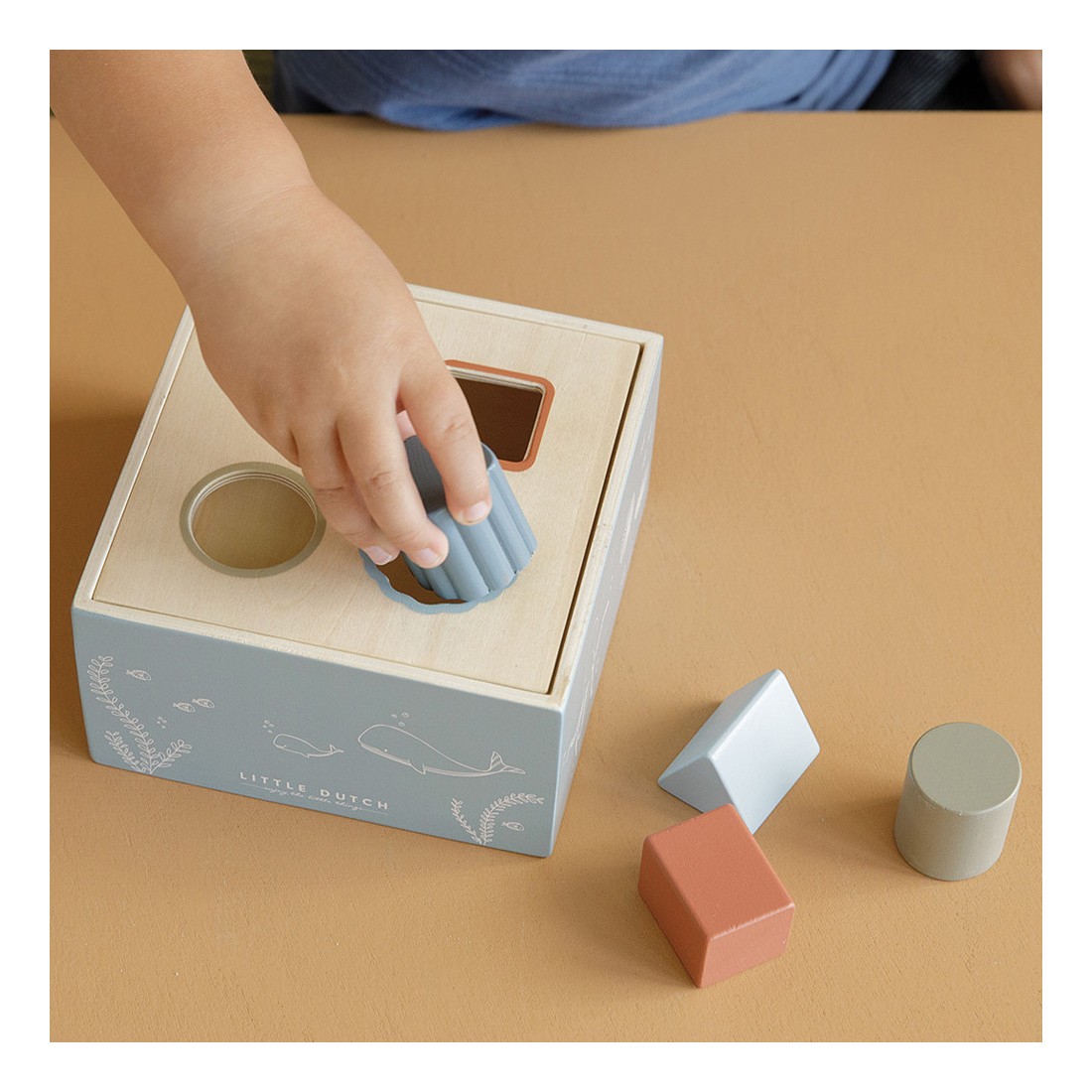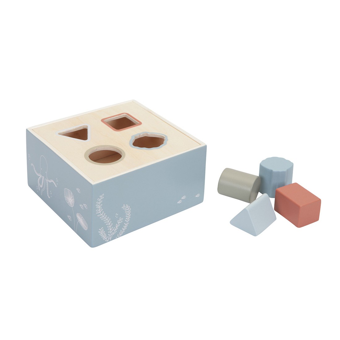 La Boîte à formes Océan : Un design marin apaisant avec des tons bleus et des motifs inspirés du monde sous-marin, idéal pour éveiller l’imagination des enfants autour des créatures aquatiques.