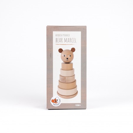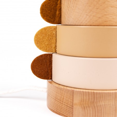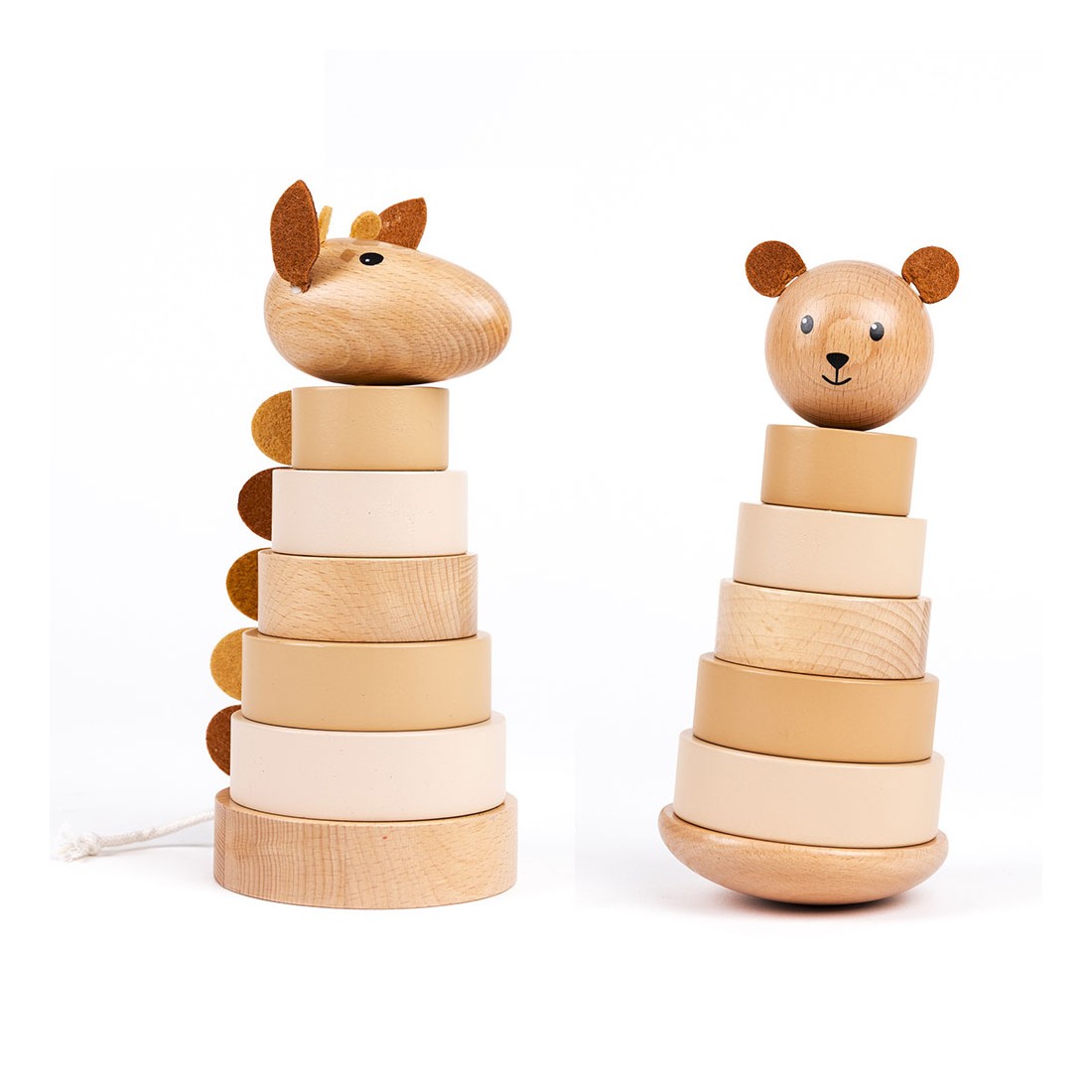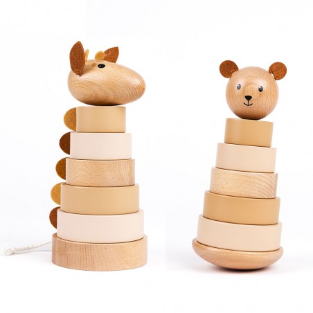 Deux pyramides complémentaires, chacune avec ses propres couleurs douces et son petit personnage en bois, pour :