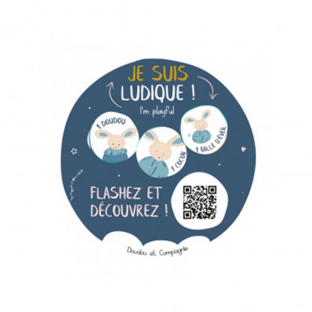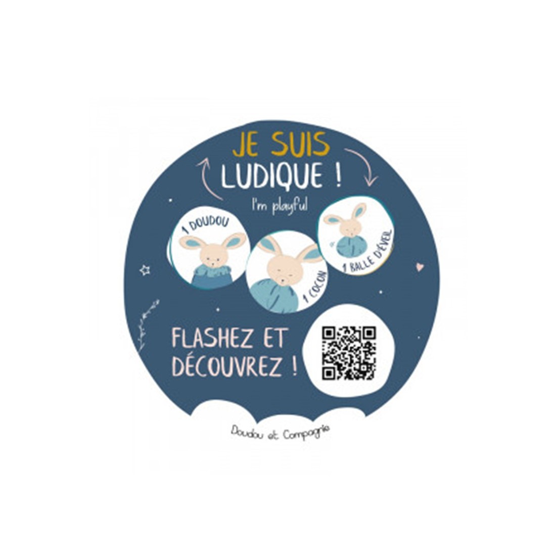 Le concept de ce doudou est astucieux : il peut se transformer en une jolie boule d'éveil. Une fois replié sur lui-même, il se glisse dans sa petite bulle de tissu pour être facilement rangé et transporté à la crèche ou chez la nounou.