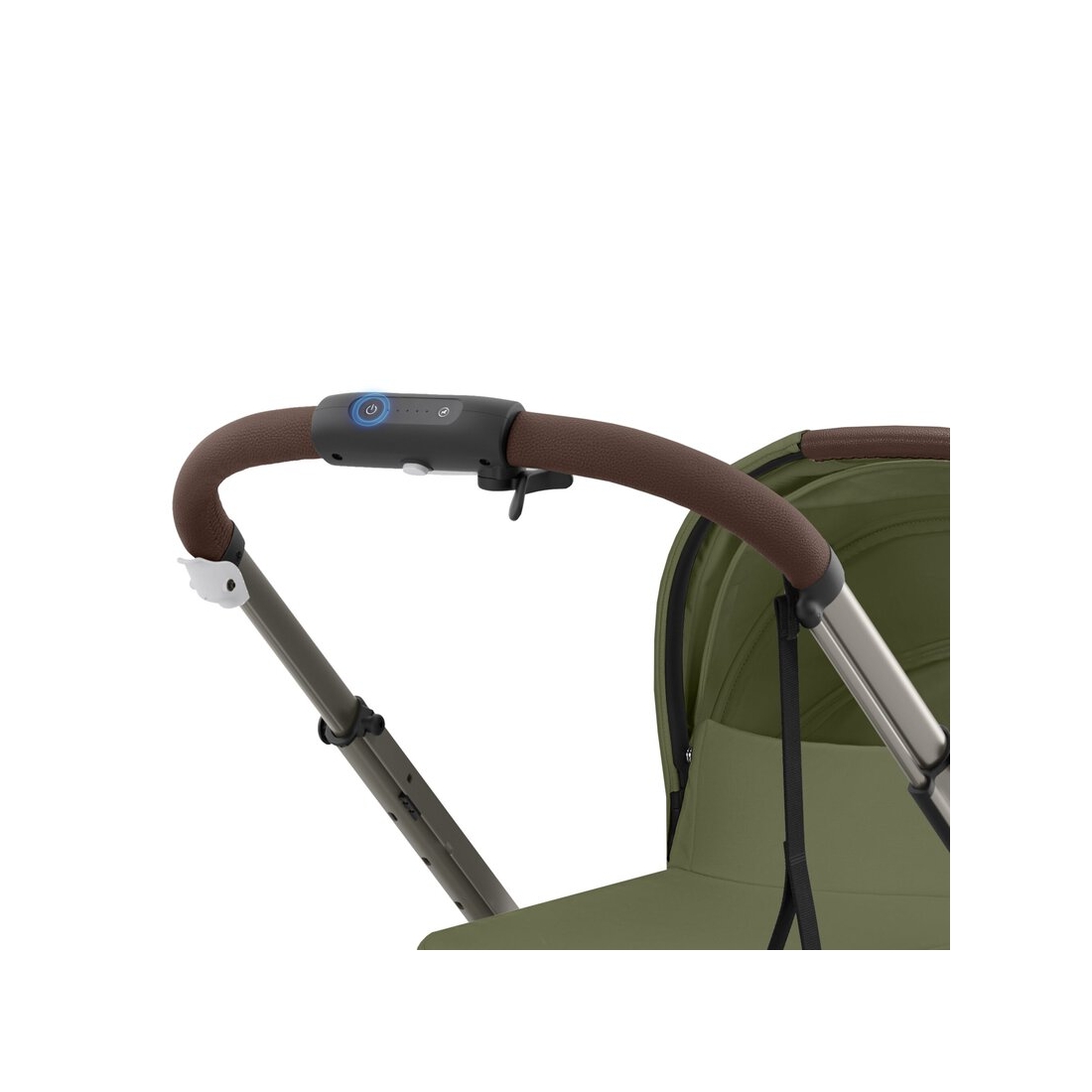 L’interface utilisateur intégrée dans la poignée permet de contrôler la vitesse via un levier intuitif, régler l’intensité du mode bercement, vérifier l’autonomie de la batterie et allumer ou éteindre la poussette facilement. Un véritable atout pour des balades fluides et sans effort.