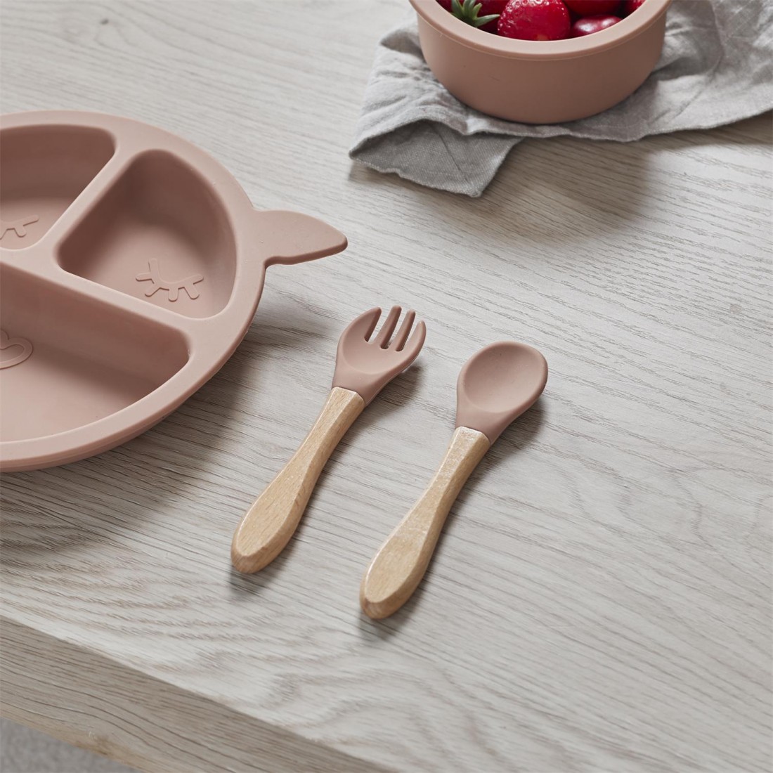 Découvrez le set de 2 couverts pour bébé en bois et silicone : Cuillère & Fourchette (1 à 3 ans)
