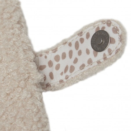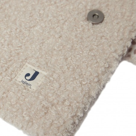 Sa texture bouclée très douce et ses dimensions 24 × 19 × 2 cm s’adaptent parfaitement aux carnets de santé distribués en France. Elle dispose d’un rabat intérieur et d’un clip sur le côté, évitant la perte des papiers.
