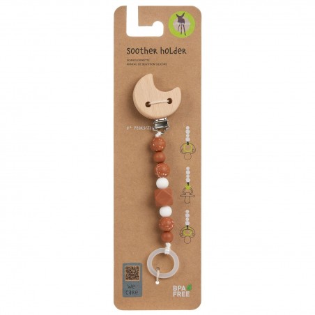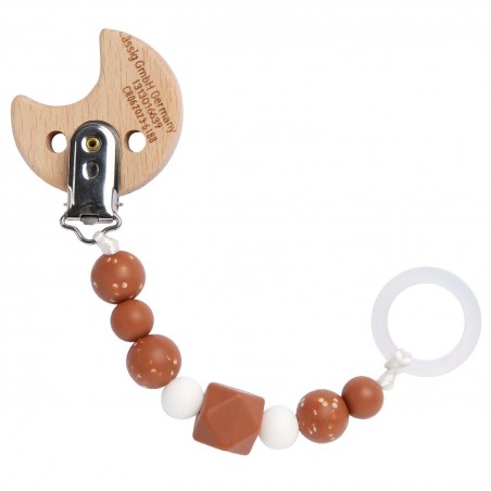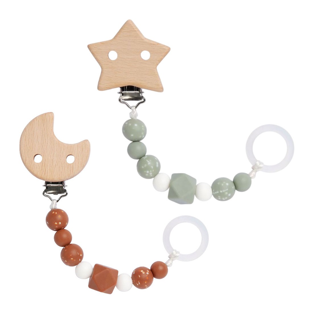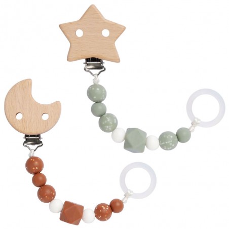 Sans BPA, chaque attache-sucette est composée d’un clip en bois avec fermeture métallique, d’une chaîne en silicone souple et d’un anneau en silicone permettant de fixer facilement la sucette. Les motifs célestes, inspirés de la lune et des étoiles, invitent les tout-petits à la découverte de l’univers tout en conservant un style sobre et intemporel.