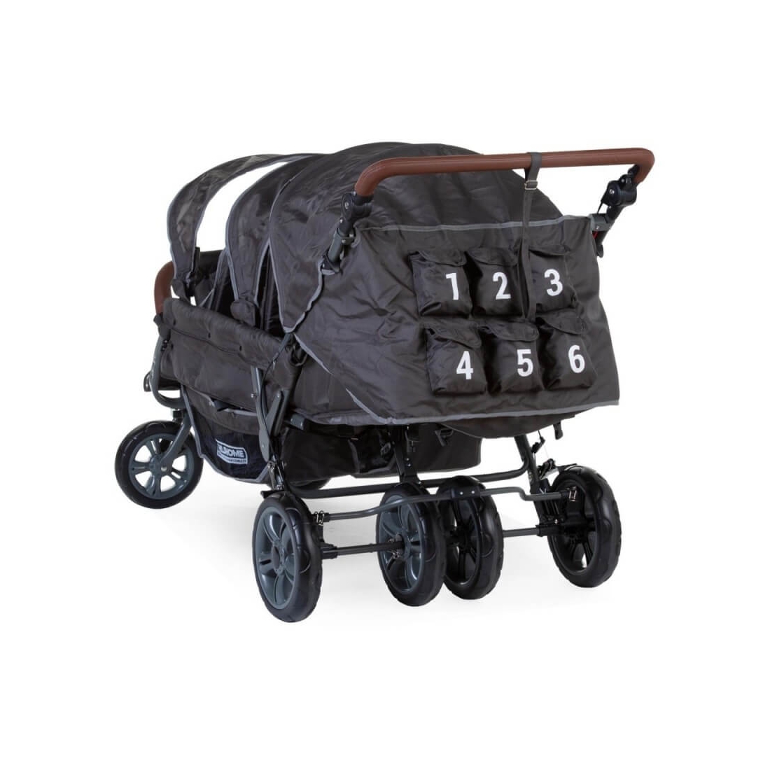La poussette Sixseater est très pratique. Elle possède deux grands paniers de rangement amovibles ainsi que des petites poches dotées de numéros correspondant à ceux qui sont inscrits sur les sièges. Ainsi vous pourrez transporter facilement tout le nécessaire pour vos petits sans mélanger leurs affaires !