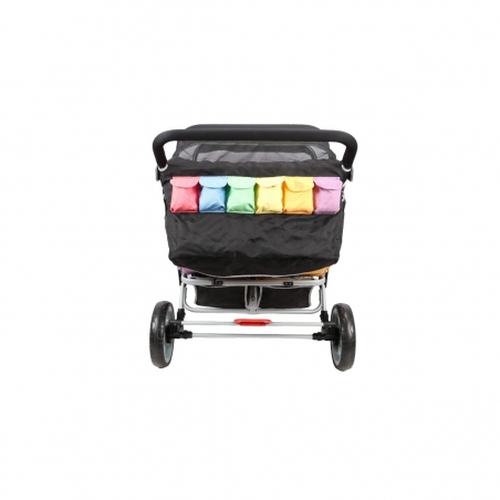 Un grand panier de rangement accessible à l’arrière et sur les côtés par fermeture zippée permet de transporter facilement les affaires des enfants.