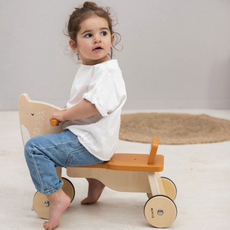 Fabriqué en bois massif certifié FSC©, il dispose de roues en bois avec une fine bande de caoutchouc assurant une bonne adhérence au sol. Cette draisienne à l’effigie du petit lion Trixie permettra à votre enfant de développer motricité, équilibre et autonomie dès 1 an.
